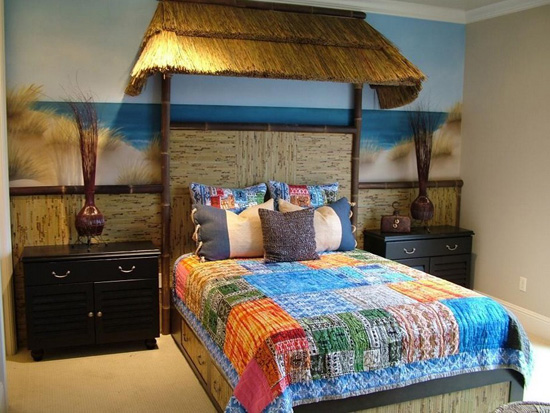 布藝是東南亞風(fēng)格特色中的一大重要元素,色調(diào)較深的家居主色調(diào)和家具,會給人單調(diào)、沉悶的感覺,多彩的布藝飾品是打破這種氣氛的最佳選擇。色彩的搭配不必過于復(fù)雜,對于家中是深色家具來說,可與之搭配的布藝顏色要以鮮艷為主,比如大紅色、鵝黃色等;如果家中的家具淺色的較多,布藝的顏色要么貼近家具的顏色,要么與之形成對比,在連續(xù)性的空間中多出那么一些跳躍性的色彩,搭配出的效果是比較有新意的。對于有宗教信仰的人來說,家中也會常見到一些面具、羊皮制品及木雕等等,突出了民族風(fēng)情的獨特。